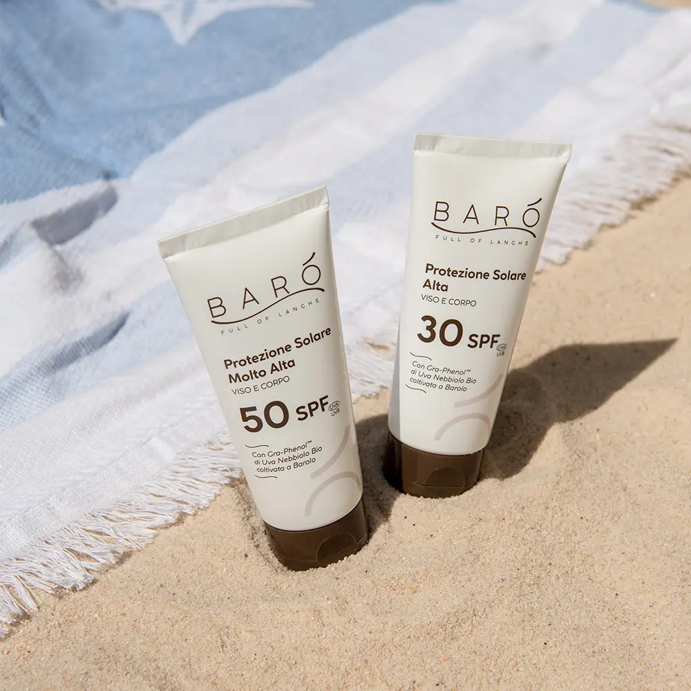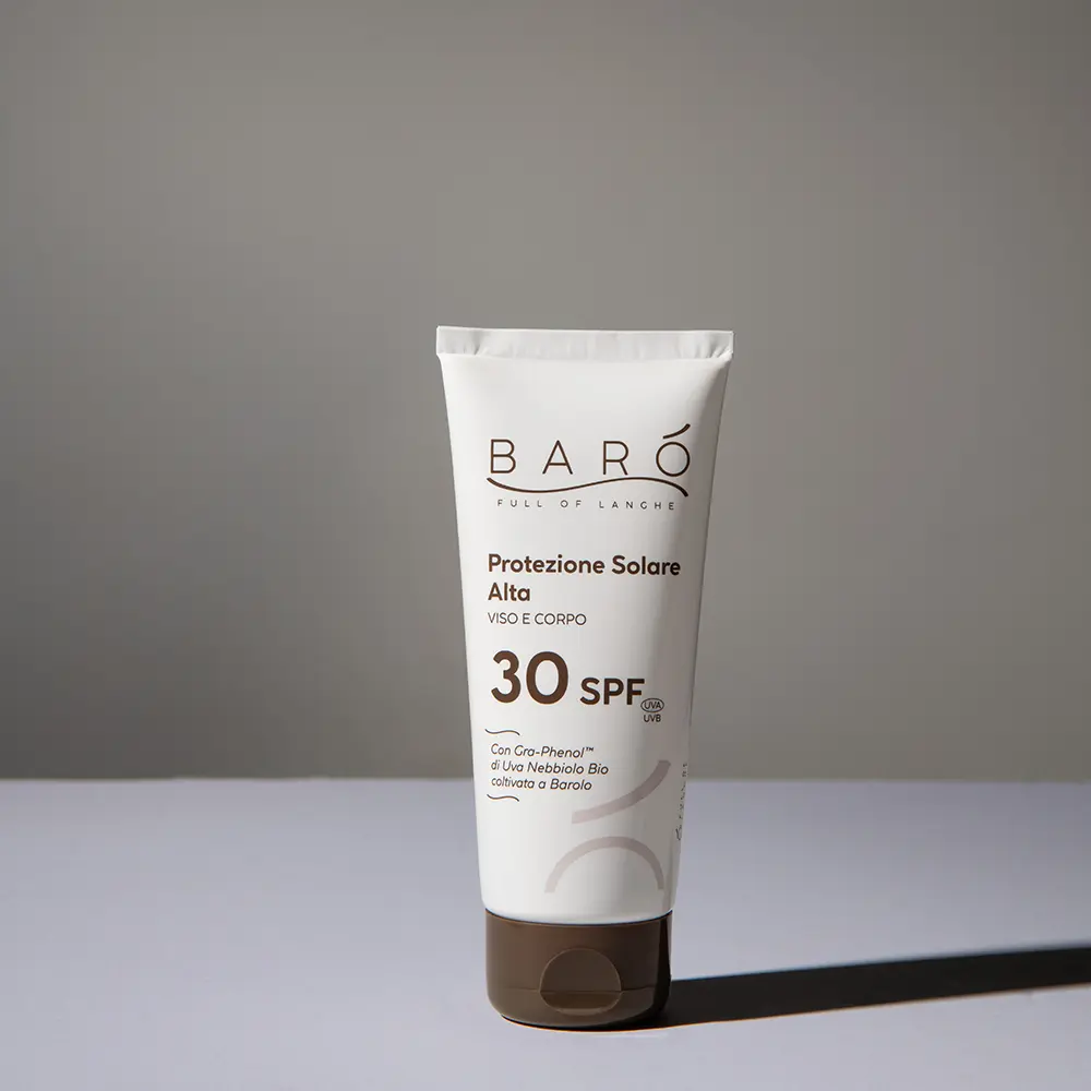 Questa crema solare viso-corpo unisce efficacia e sostenibilità, grazie a una formula con filtri solari ocean friendly, sicuri per la pelle e rispettosi dell’ambiente marino. Il cuore della formula è il Gra-Phenol®, un attivo esclusivo estratto da Uva Nebbiolo Bio coltivata a Barolo, ricco di polifenoli dall’intensa azione antiossidante. Difende la pelle dai raggi UVA e UVB, aiutando a prevenire scottature, danni cellulari e invecchiamento precoce.