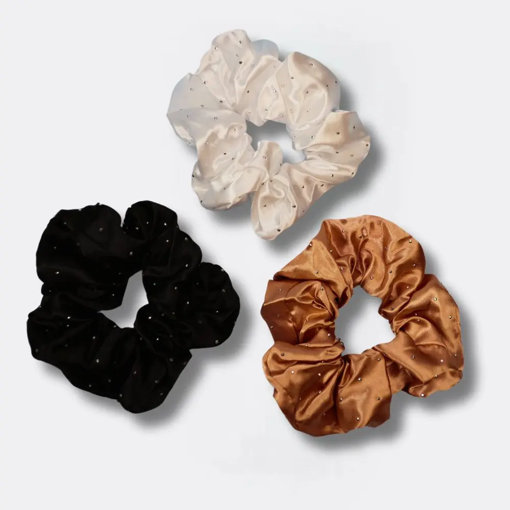 Set di 3 Scrunchies in raso impreziositi da strass scintillanti. Disponibili in 3 colori moderni e versatili, sono perfetti per aggiungere un tocco di eleganza a qualsiasi look, dal quotidiano alle occasioni speciali.